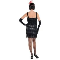 Sip a little moonshine and shimmy to a hot jazz beat in this fashionable flapper costume! This Flashy Flapper Costume features a shoulderless black flapper mini dress layered with cascading tiers of gleaming black fringe that shakes to the rhythm of the music. A matching black sequin-covered elastic headband with red feather plume completes the retro look.