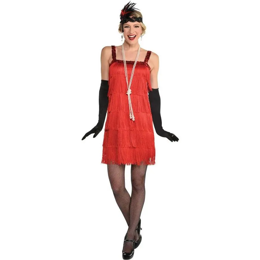 You’re ruby red and ready for fun in this figure-flattering flapper costume for adults. The perfect start to your Roaring 20s or vintage Hollywood look, the flapper dress features classic tiered fringe that flaps when you do and red sequin trim at the bust line. Just add pearls and you’re off to the speakeasy!