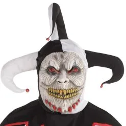 More on Adult Sinister Jester Costume Plus Size: You’ll scare everyone in the royal court wearing a Sinister Jester Costume Plus Size for men. This plus-size jester costume features a mask with red eyes to match the bells hanging off the jester hat. The black and white harlequin-print tunic features blood red trim and pom-poms. A bone ribcage is printed on the front of the tunic for a scary effect. The matching pants have an elastic waistband for added comfort as you torment spectators or trick-or-treaters. Tie your look together with the included black sash and cause laughs or screams on Halloween night. Review the size chart for additional sizing information. Shoes, cane, and gloves not included.