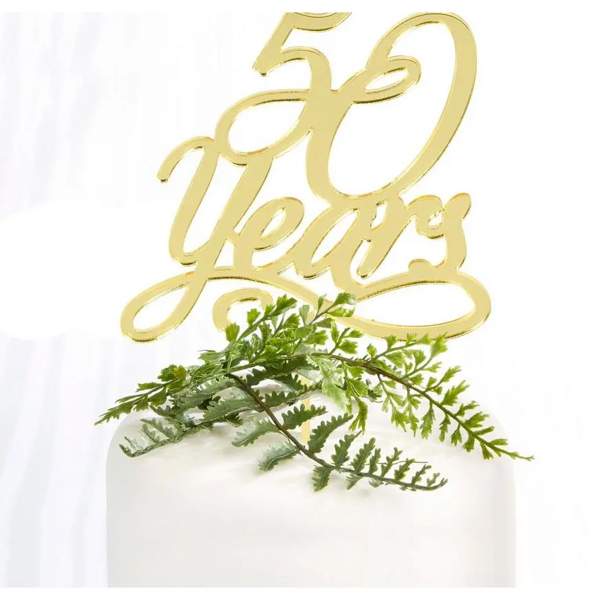 Top off your anniversary cake with a Gold 50th Anniversary Cake Topper! This plastic cake decoration is shaped like cursive letters that spell out “50 Years.” The cake decoration has a mirror effect and comes in elegant gold to match other gold party decorations. Simply place this topper on the top of your dessert to add an elegant and decorative touch during a special 50th anniversary party or cocktail party!