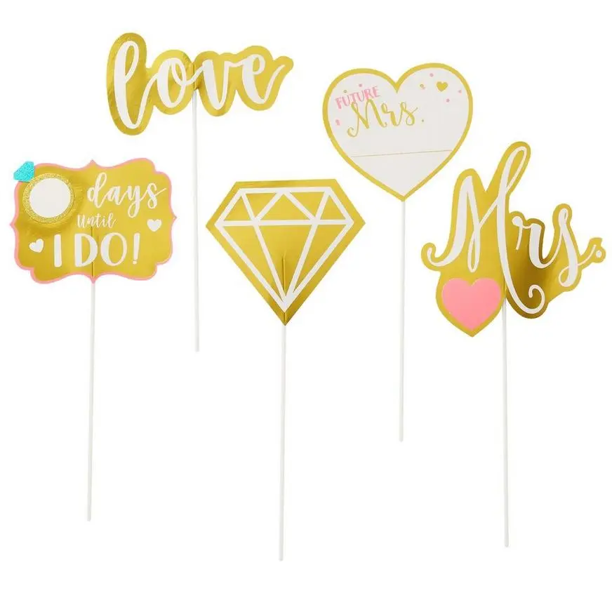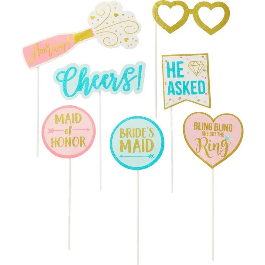 Throw the bride-to-be a celebration to remember using a Sparkling Pink Bridal Shower Photo Booth Kit! This party kit includes cardstock cutouts attached to plastic sticks for the bride, bridemaids, and other guests to hold as they pose for photos. The wedding photo props include rings, diamonds, champagne glasses, and fun phrases such as “Off The Market,” “Cheers To The Future Mrs.” and “I Do Crew.” This pack of wedding decorations even features a gold foil backdrop. Have wedding photo booth props camera-ready at your bridal shower or engagement party to create fun memories of the big day.