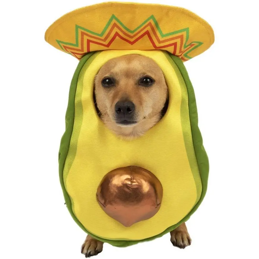 Your doggy friend will steal the show at the Cinco de Mayo fiesta or Halloween party as the Avocado Sombrero! This canine costume features a green avocado tunic, sliced in half with the pit exposed, and an attached sombrero.