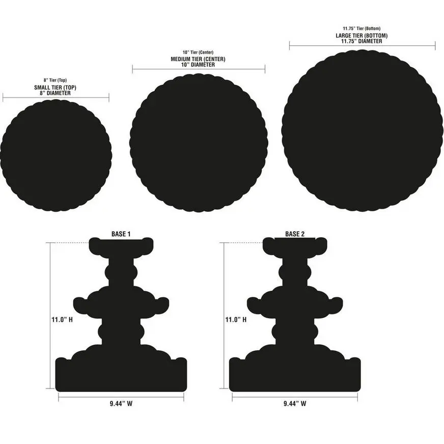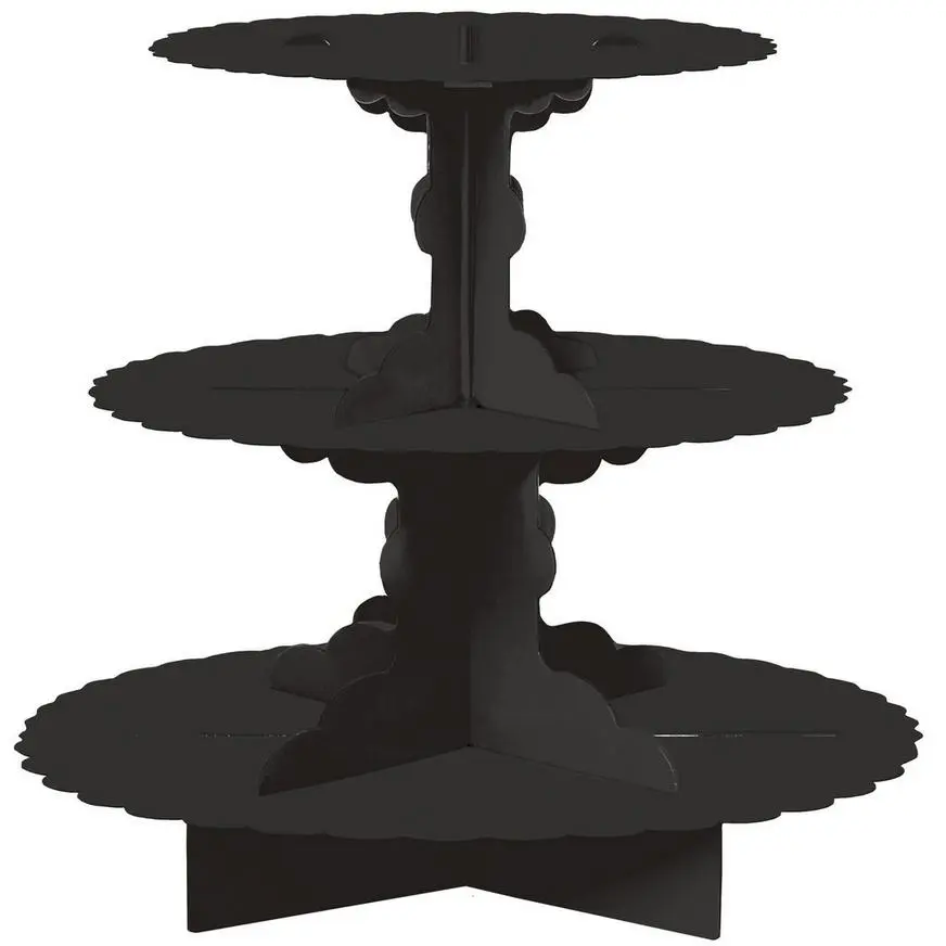 A Black Cupcake Stand provides a bold and sophisticated touch to any party table! This ink-black, three-tiered cupcake stand comes with scalloped-edge borders for a stylish look. Durable and easy to assemble, this treat stand is perfect for cupcakes, candy, cookies, appetizers, or other delicious treats!
