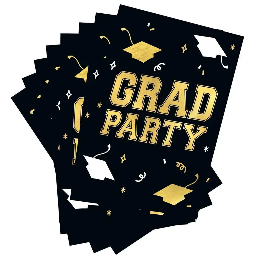 Let friends and family know it’s time to celebrate with black and gold graduation party invitations! The cards are black on the front with white and gold mortarboards. The back has space for all the party details. The set includes white envelopes and matching black and gold envelope seal stickers.
