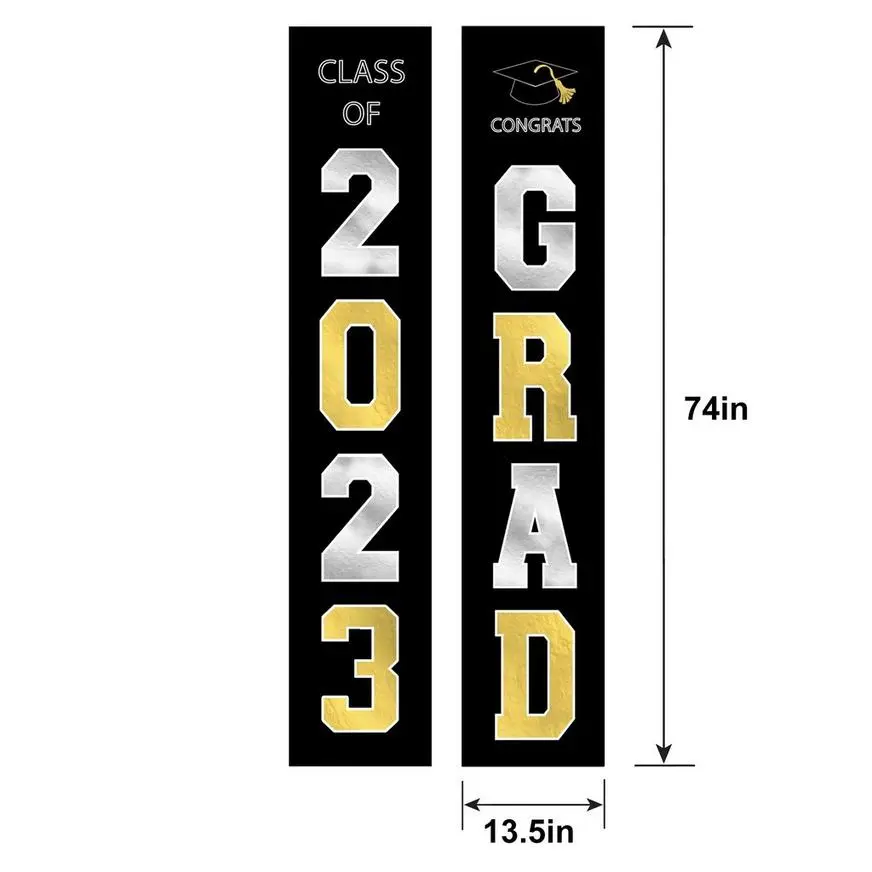 Welcome guests and recent grads to your celebration with these two hanging banners! They read “Class of 2023” and “Congrats Grad” in metallic gold and silver.
