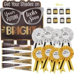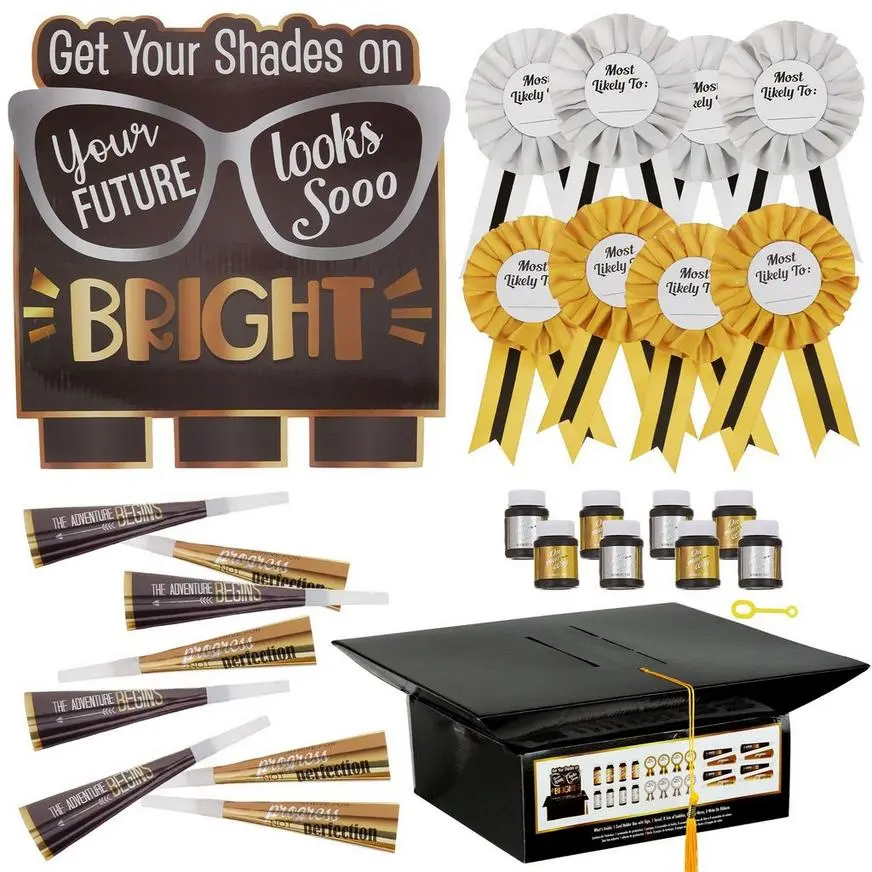 This pre-packed graduation party kit has the favors needed to keep guests busy. It contains bubbles, horns, and award ribbons in an elegant black, silver, and gold color scheme with clever slogans on each. The box even turns into a card holder to keep all of the gifts contained and in one place.