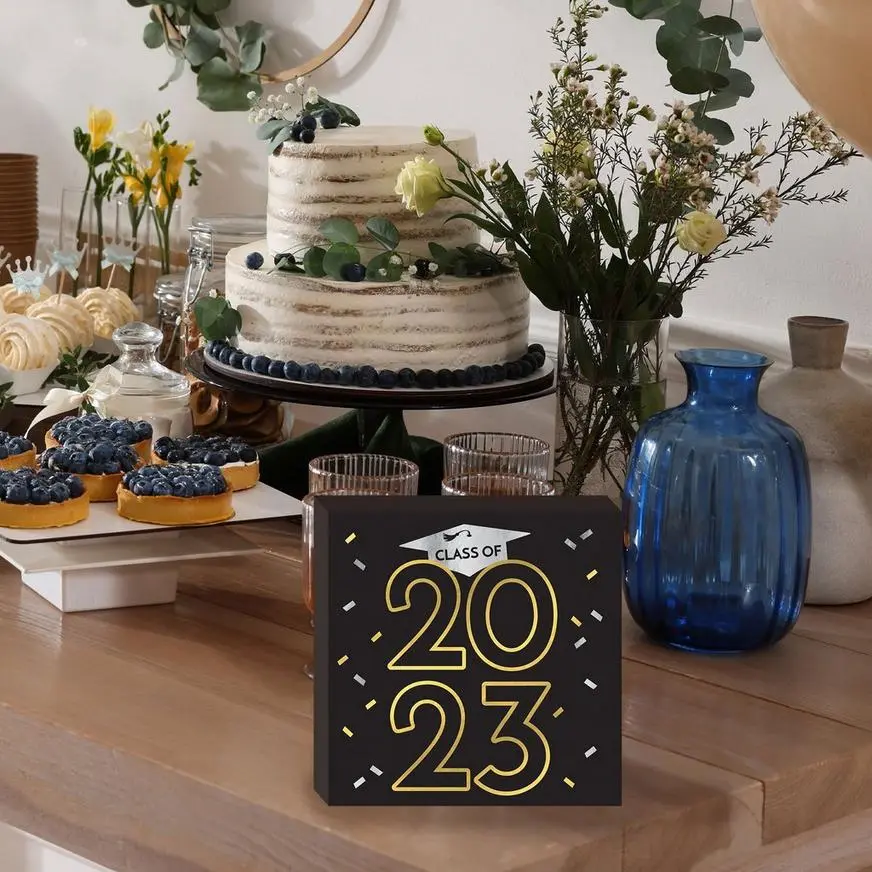 Add a glitzy touch to your grad party table with this standing decoration! The fiberboard sign reads “Class of 2023,” complete with a metallic silver mortarboard cap.