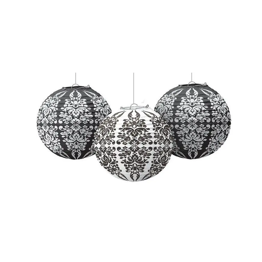 Black & White Damask Paper Lanterns add a subtle, elegant touch to your wedding celebration! These round paper lanterns include two with white damask patterns on a black background and one with a black damask pattern on white. Easy-to-assemble, the lanterns also include strings to hang from the ceiling or door frame for a buoyant party atmosphere. Display wedding lanterns at your bridal shower, engagement party, or anniversary party.