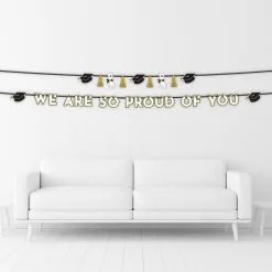 Make the grad feel valued by decorating their party with a letter banner that says just how you feel about their achievement. This banner set includes a black, white, and gold cardstock letter banner that reads “We Are So Proud Of You” and an accent banner featuring mortarboards, diplomas, and tassels. Layer the banners for a textured look or use them to decorate separate parts of the party space!