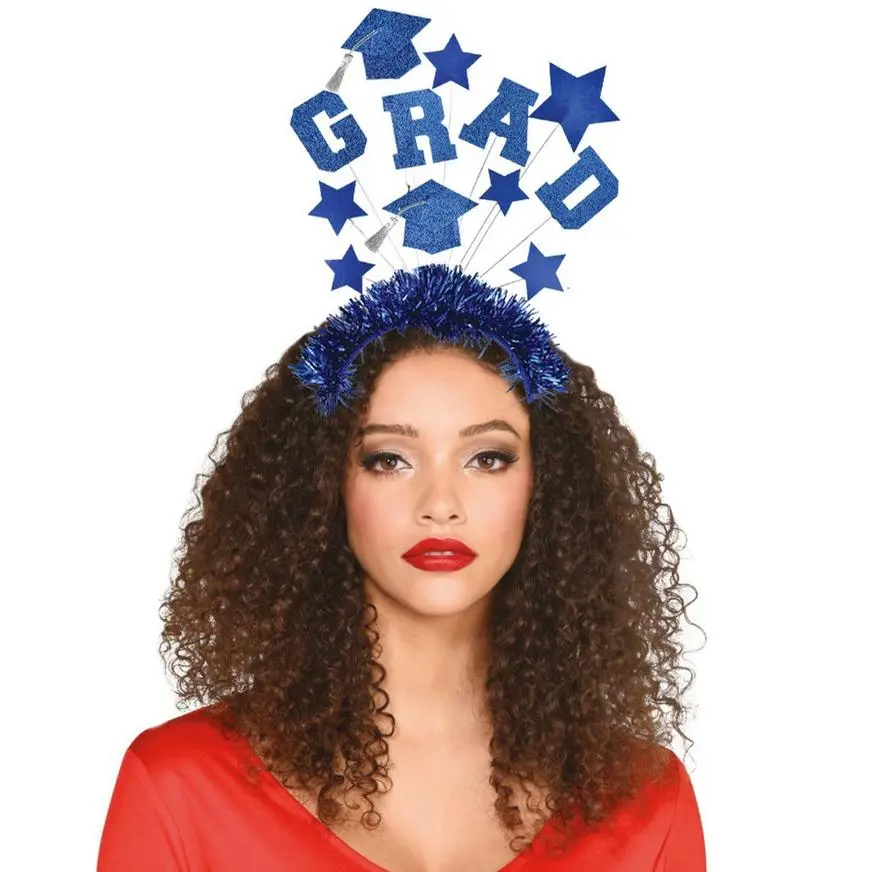 A headband is the perfect accessory for the new grad or graduation party guests. This one features a bed of blue tinsel with matching star, graduation cap, and “Grad” cutouts on top.