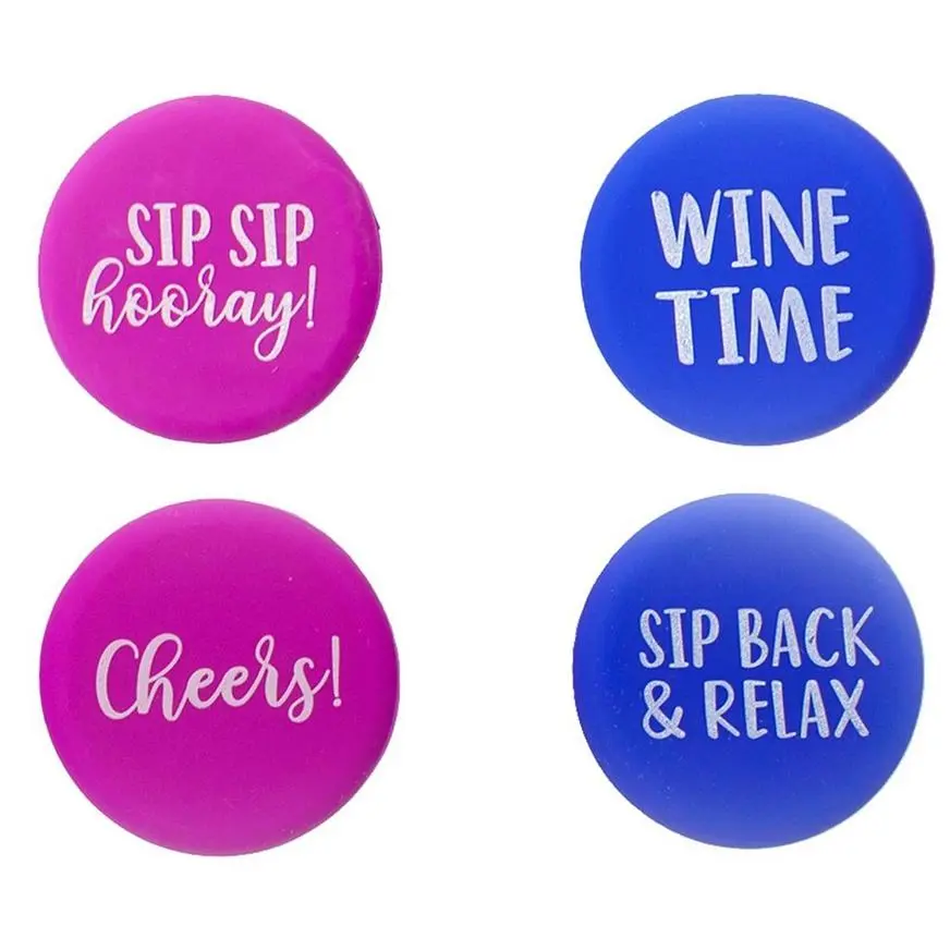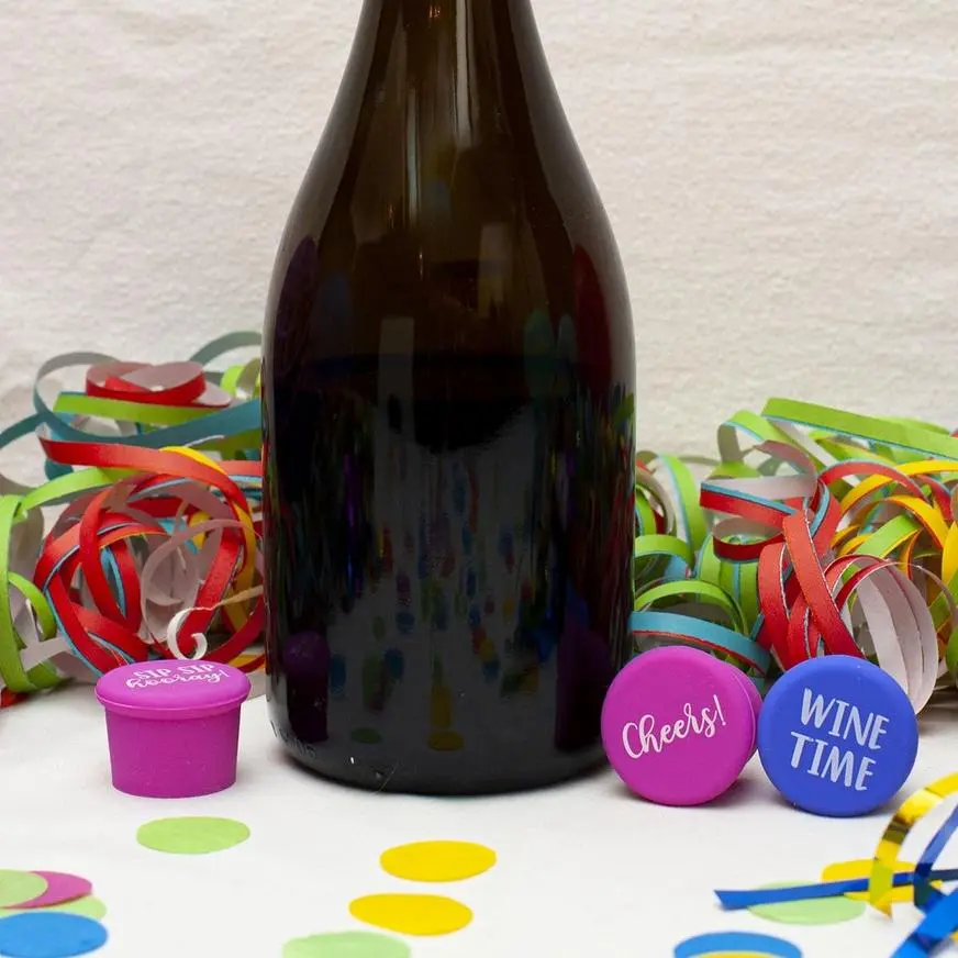 Save the bottle to savor later with Silicone Bottle Caps! These pink and blue bottle caps feature fun party phrases, like “Wine Time” and “Sip, Sip Hooray!”