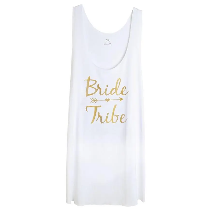 Let the world know who is a part of the crew by gifting everyone in your bridal party a Bride Tribe Tank Top. The white tank top features the headline “Bride Tribe” in metallic gold. Wear the tank top during bachelorette festivities, while dress shopping, or on the big day before changing into wedding outfits.