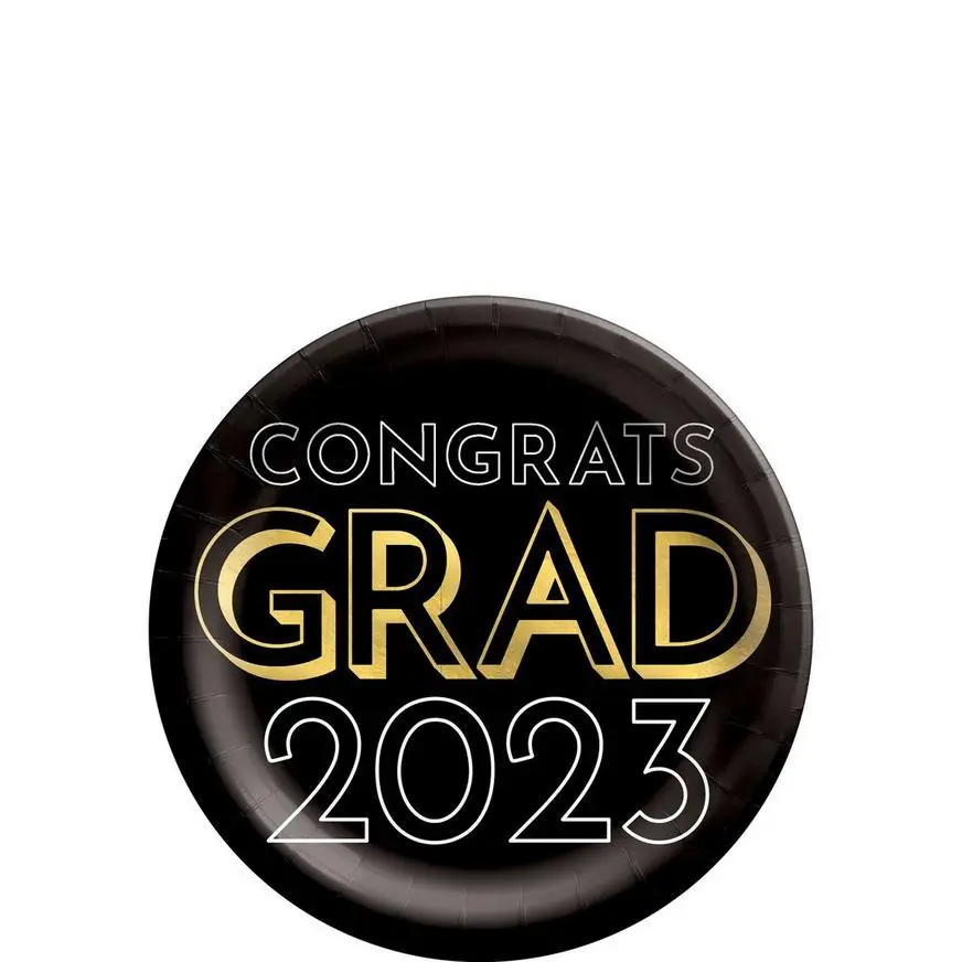 Show how proud you are of your recent graduate with these dessert plates! The small round paper plates are black with metallic gold and silver “Congrats Grad 2023,” plus confetti and a mortarboard.