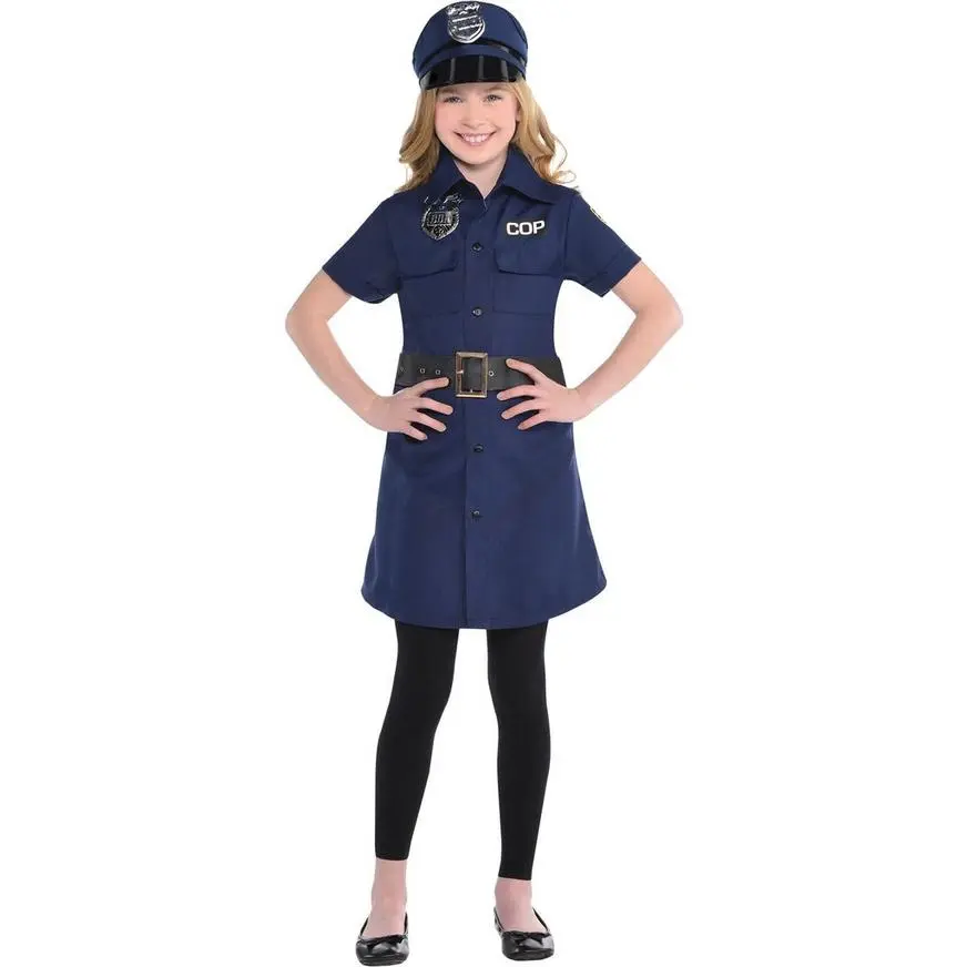 Your little girl will lay down the law in our Cop Dress!. This short-sleeve, navy blue police costume dress features a value-down front with police patches on the sleeves and “COP” embroidered on the chest. Pockets with flaps and a faux leather belt add authenticity on this mid-length police dress. Round out the look with a kid-sized police cap (sold separately) and she’s on the beat!