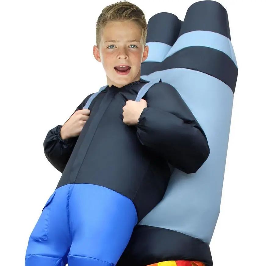 More on Child Inflatable Jetpack Costume: Watch your little one fly into the classroom costume party in an Inflatable Jetpack Costume for kids! The costume includes an inflatable jumpsuit designed to look like a body attached to a large jetpack with shooting flames. Inflate the costume using the included fan and your little one is ready to take off! Review the size chart for additional sizing information.
