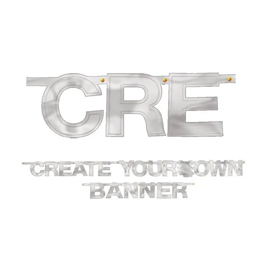 Say whatever you like with this Create Your Own Banner kit. Silver letter banner features silver foil letters, numbers and fasteners than can be put together to display your special message. Perfect for weddings, showers, anniversaries or receptions. Kit includes 68 foil letters, numbers 0-9, 6 bell spacers and plastic fasteners. Reusable. Letters and numbers measure 4 1/2in tall.