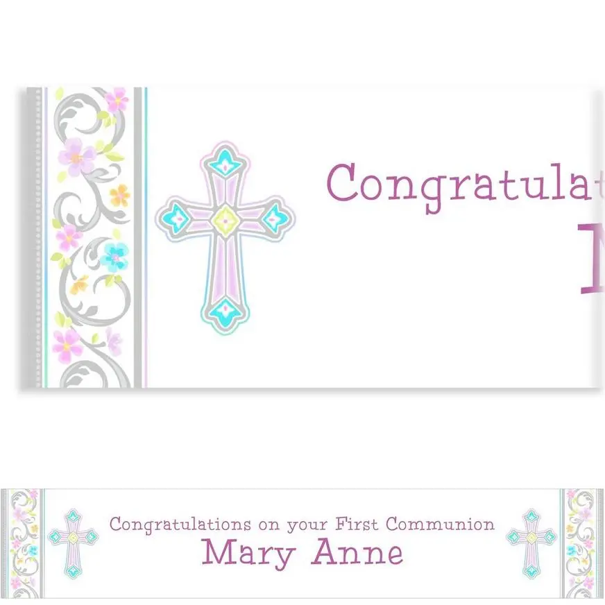 Make a big statement at your party with a personalized banner. This 72″ x 13″ banner matches the Blessed Day custom invitation. It’s easy to customize with any name or message, and you can even change the font and text color!