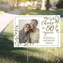 Direct guests to the party with a Custom Gold 50th Plastic Photo Yard Sign. The outdoor sign features a script “Cheers To 50 Years” headline and a swirling vine border. Make it special by adding a photo and customizing your message with the variety of fonts and colors. It’s made of sturdy corrugated plastic and is easily secured into lawns using the included metal stake.