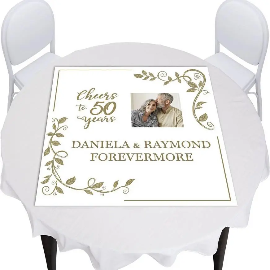 Set up a one-of-a-kind tablescape with a Custom Gold 50th Anniversary Vinyl Photo Square Table Topper. This vinyl table decoration features a script “Cheers To 50 Years” headline and a swirling vine border. Make it special by adding a photo and customizing your message with the variety of fonts and colors. Made of durable vinyl, this tablecloth cover makes cleanup a breeze. Pair the topper with other white and gold tableware to complete your table setting.
