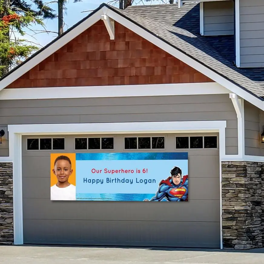 The custom Justice League Photo Horizontal Banner features Superman, a blue background, and space for a personalized message and photo. With three sizes to choose from, the banner makes a big statement and is a perfect way to celebrate the guest of honor or let guests know where the party is! Itβs easy to customize your message on the party banner, and you can change the font and text color. This personalized banner can be printed on standard indoor/outdoor 10oz vinyl or heavy-duty 13oz vinyl, durable enough for outdoor use, and both weights feature latex ink that wonβt fade.