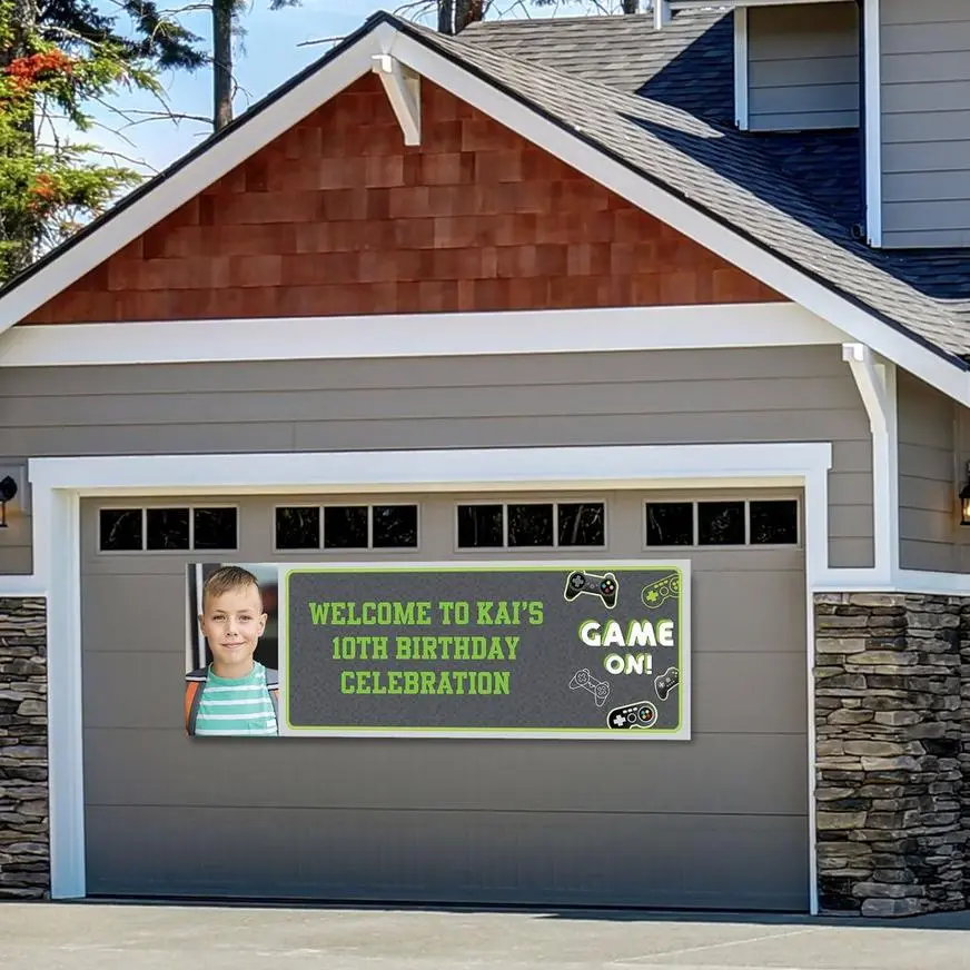 This custom Level Up banner features game controllers, a pixelated background, a “Game On” headline, and space for a photo and your very own message. It’s easy to customize the message by choosing from the selection of font styles and text colors. A banner is the perfect way to celebrate the guest of honor and instantly lets guests know where the party is. This personalized banner is printed with fade-resistant latex ink on standard 10oz vinyl or heavy-duty 13oz vinyl that’s durable enough for outdoor events.