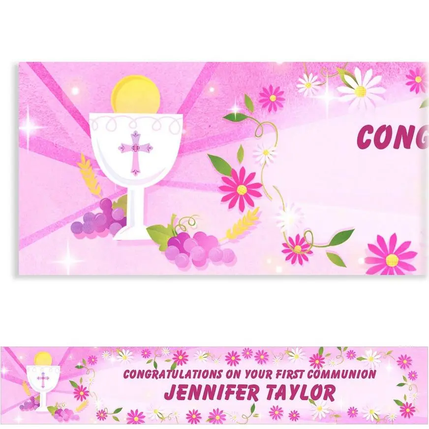 Make a big statement at your party with a personalized banner. This 72″ x 13″ banner matches the Pink First Communion party ensemble. It’s easy to customize with any name or message, and you can even change the font and text color!