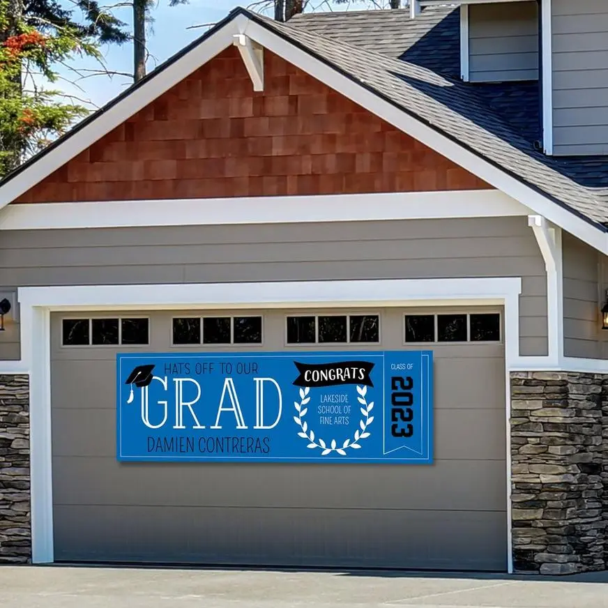 This custom graduation banner features “Hats Off To Our Grad,” “Congrats,” and “Class Of” headlines on a solid blue background. Make it your own by adding their name, school, and graduation year and selecting from the variety of font styles and colors. Banners make a big statement and are the perfect way to celebrate the guest of honor or let guests know where the party is. This personalized banner is printed with fade-resistant latex ink on standard 10oz vinyl or heavy-duty 13oz vinyl that’s durable enough for outdoor use.