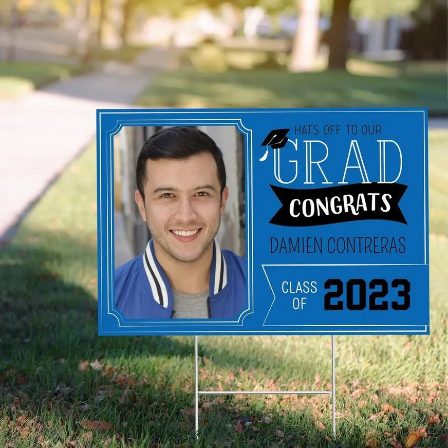Direct guests to the party with a custom graduation yard sign. The vibrant blue sign features “Hats Off To Our Grad,” “Congrats,” and “Class Of” headlines. Make it your own by adding the grad’s name, school, and graduation year and selecting from the variety of font styles and colors. The outdoor sign is made of sturdy corrugated plastic and can be placed in your lawn using the included metal stake.