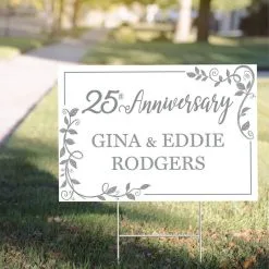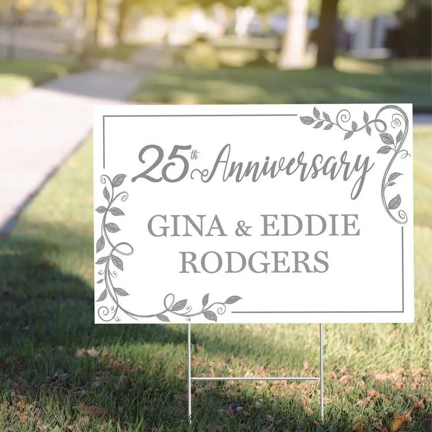 Direct guests to the party with a Custom Silver 25th Anniversary Plastic Yard Sign. The outdoor sign features a script “25th Anniversary” headline and a swirling vine border. Make it special by customizing your message with the variety of fonts and colors. It’s made of sturdy corrugated plastic and is easily secured into lawns using the included metal stake.