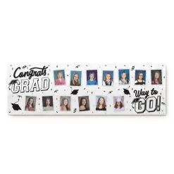 This custom graduation banner features “Congrats Grad!” and “Way To Go!” headlines on a black and white background. This large banner is the perfect size to display photos of an entire graduating class, or to show one grad throughout the years. Simply print out your photos and attach them to the banner for a personalized grad party display. Banners make a big statement and are the perfect way to celebrate this milestone achievement. This personalized banner is printed on durable plastic that’s reusable and holds up to outdoor use.
