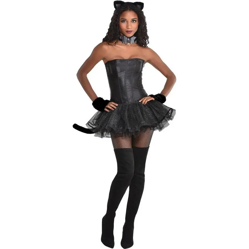 Dark as midnight. This Dark Kitty Costume Accessory Kit is a 4-piece set consisting of a fabric-covered headband featuring glittery silver ear flaps, fingerless glovelettes, tail and ruffled choker with silver-tone glittery trim and a bell and bow at front. Complete your costume with these accessories. Corset, tutu and tights not included.