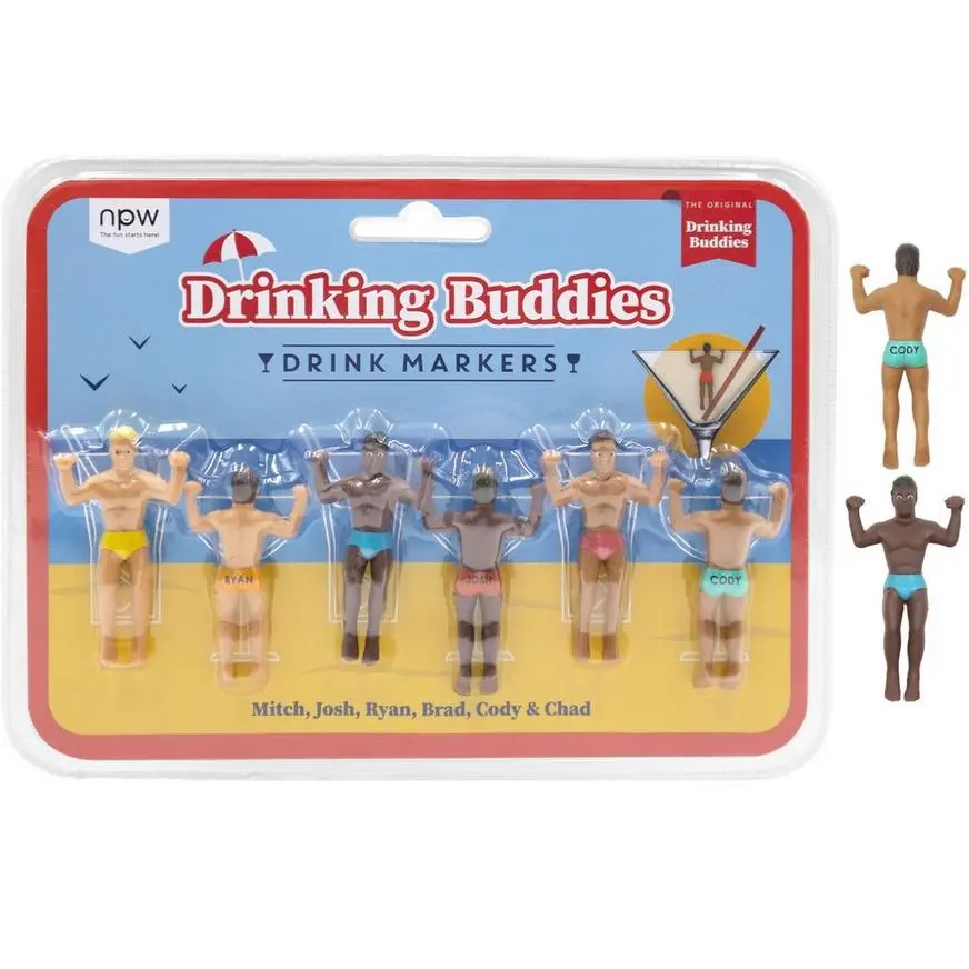 Keep track of the cocktails at your summer soiree with Drinking Buddies! These plastic drink markers are six muscular men ready for fun in the sun and designed to hang off your glass. Mark off your refreshment with Mitch, Josh, Ryan, Brad, Cody, or Chad!