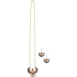 Walk, talk, and accessorize like an Egyptian in this Egyptian Jewelry Set! This metal jewelry set features gold metal and enamel finish on a pair of lotus blossom earrings and a necklace of Horus the Falcon God. Wear this Egyptian Jewelry Set as part of your Halloween Cleopatra costume or Halloween goddess costume!