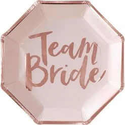 Celebrate the bride to be with these Ginger Ray Metallic Rose Gold Team Bride Lunch Plates! Each octagonal paper plate features the headline “Team Bride” in the center of a pink background with a rose gold border. These adorable plates will make up the perfect table setting for the bachelorette party or wedding shower guests and make eating tasty party treats easy!