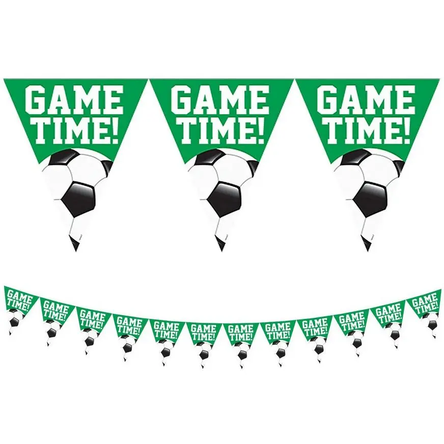 Everyone will know there’s a party going on with the Goal Getter Soccer Pennant Banner! This green soccer banner features the headline “Game Time!” with a soccer ball image. Hang this soccer-themed banner from the ceiling, a table, or mount on a wall to add a festive kick to your soccer party. Whether for a soccer-themed birthday party, soccer team party, or sports-themed party, the Goal Getter Soccer Pennant Banner will complete your soccer decor.