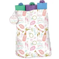 Transport your wedding gifts in style with this Gold & Pink Wedding Gift Sack! This white plastic sack features headlines like “Pop The Bubbly” and “Cheers To Many Years” surrounded by printed champagne glasses, diamond rings, and banners. The sack comes with a matching gift tag in the shape of a diamond ring and reads “Cheers To Many Years” in the center. Fill this drawstring sack with your wedding or wedding shower gifts or use it to wrap one large present for someone special!