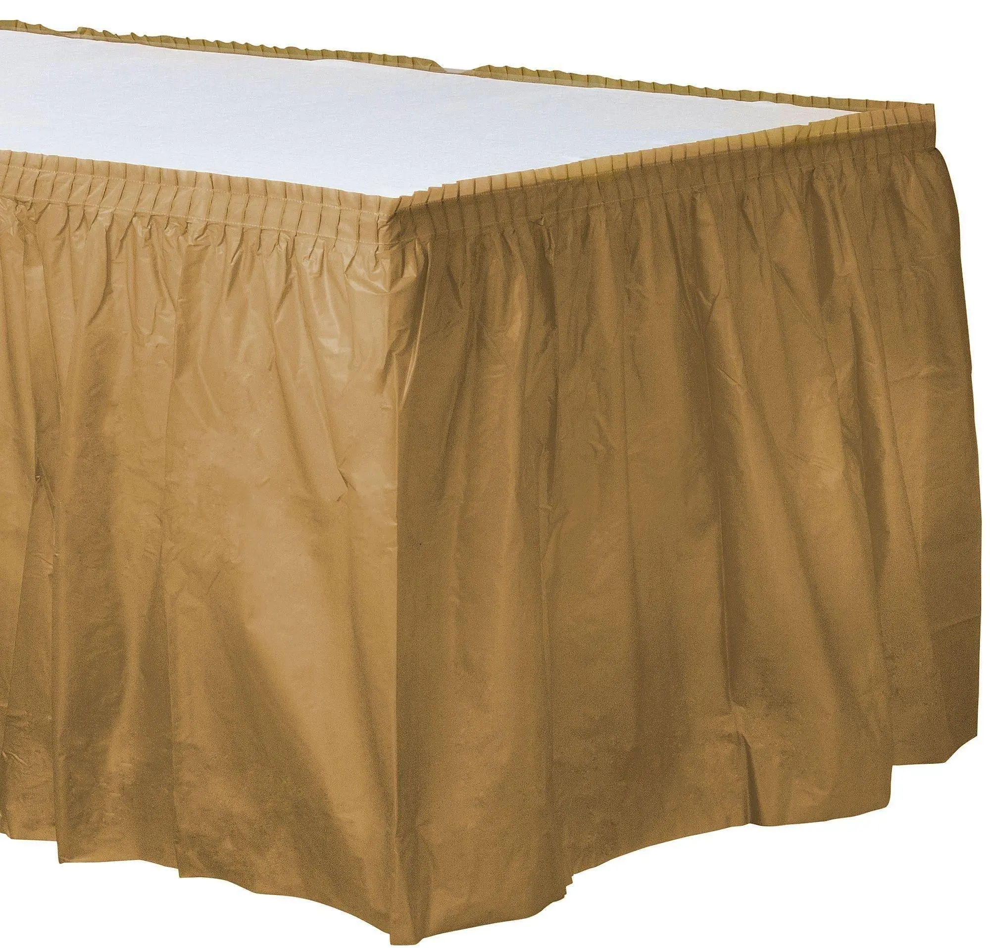 Deck out your table with a Gold Plastic Table Skirt! This gold table skirt is a quick and easy way to add some colorful, festive flair to your party. The skirt covers all four sides of an 8ft x 2.5ft table, and its adhesive backing makes it easy to use for smaller tables. Use it at your gold-themed party — it’s also a clever way to hide extra party supplies you might be storing under your buffet tables!