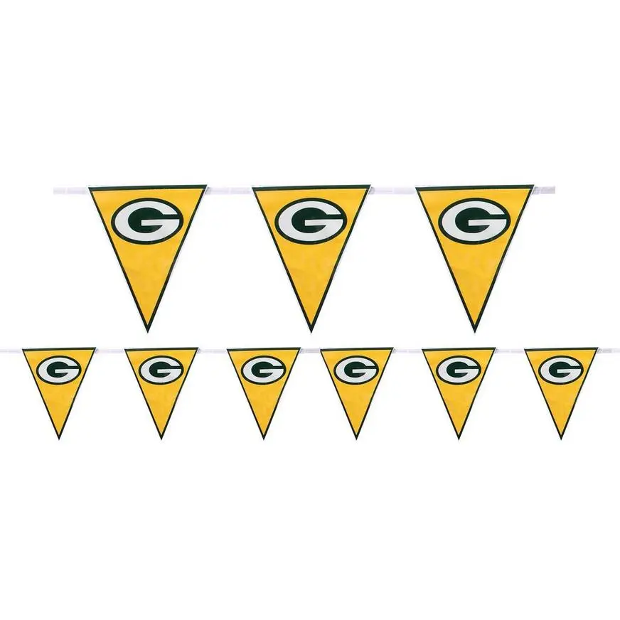 Get your party ready for some football! This Green Bay Packers Pennant Banner features the logo and colors of your favorite football team printed on one side of each flag. With strings on each side for easy hanging, this officially licensed decoration is perfect for game day or a sports-themed party.