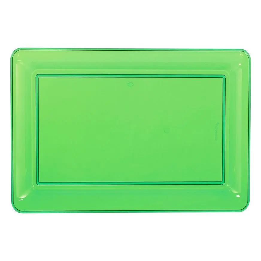 Serve your guests in style with a Kiwi Green Plastic Rectangular Platter. A go-to entertaining essential, this tray is smartly styled with upturned sides to keep hors d’oeuvres, mini appetizer plates, and glasses from sliding off. Made of plastic, this transparent green tray coordinates with any party theme while enhancing your food presentation.