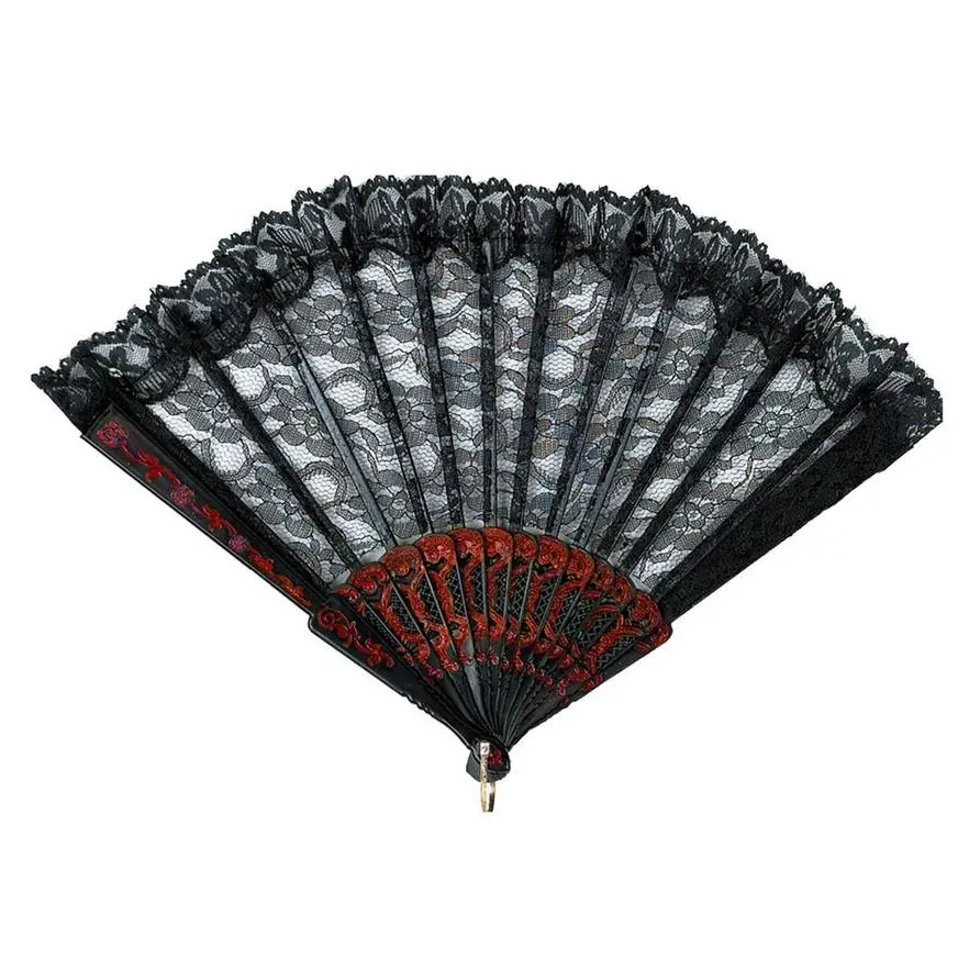 Be alluring while you keep cool! Our Lace Spanish Fan completes your coy senorita look. This elegant working Spanish Fan features black lace leaf and black ribs with painted metallic floral embellishments. Spanish Fan measures 9in long and opens to a full 18in spread.