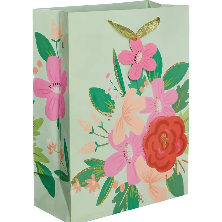 The perfect gift meets the perfect packaging with this Large Glossy 3D Pink Floral Gift Bag! The large mint green paper gift bag features pink blooms, glitter details, and a single coral flower cutout that gives a 3D effect. Its gold ribbon handle has a pink, flower-shaped gift tag attached so you can write a message for the guest of honor. Put linens, homeware, and other presents in this gift bag and it’s instantly ready for giving!