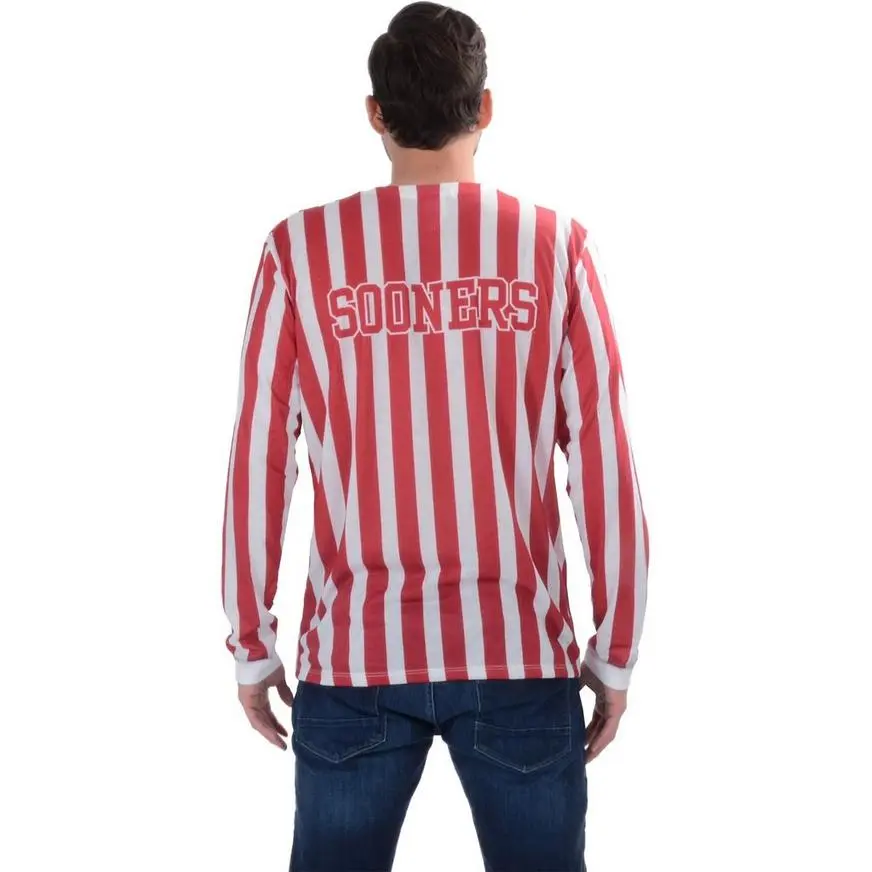 Show your school spirit in style with this Oklahoma Sooners Striped Suit Long-Sleeve Shirt. This soft and comfortable t-shirt has been photo-realistically printed with crimson and cream stripe suit with tie. GO TEAM! Review the size chart for additional sizing information.