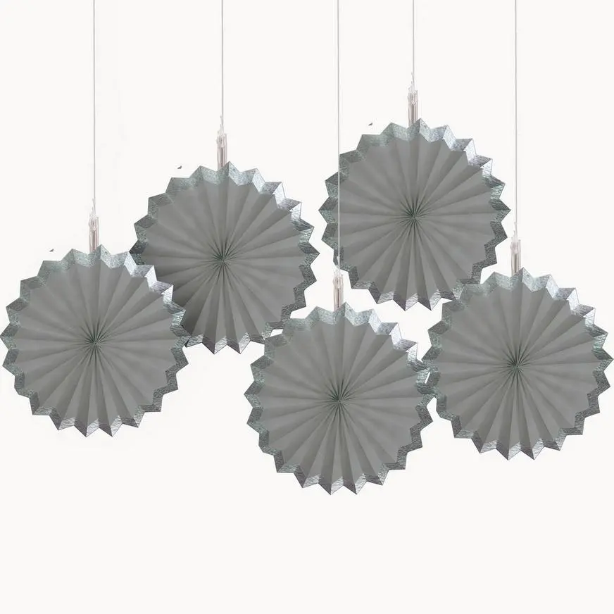 Brighten up your party décor in minutes with shimmering paper fans! These hanging fan decorations feature a silver center with a matching metallic border. Use the attached strings to hang them up wherever you need an eye-catching party decoration.
