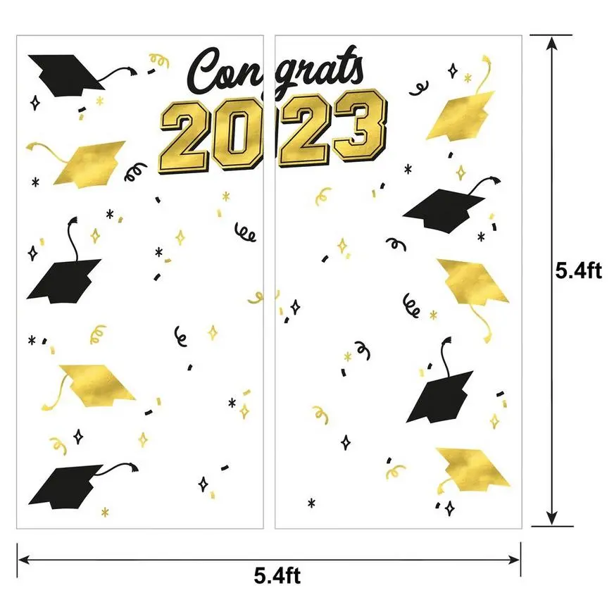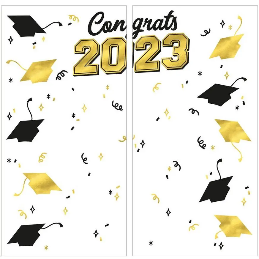 Gather your whole grad party crew for pics in front of this photo backdrop! The white plastic backdrop has black and metallic gold mortarboards and confetti, plus a matching “Congrats 2023” headline. The posters are easy to hang with tape or Sticky Tack (sold separately).