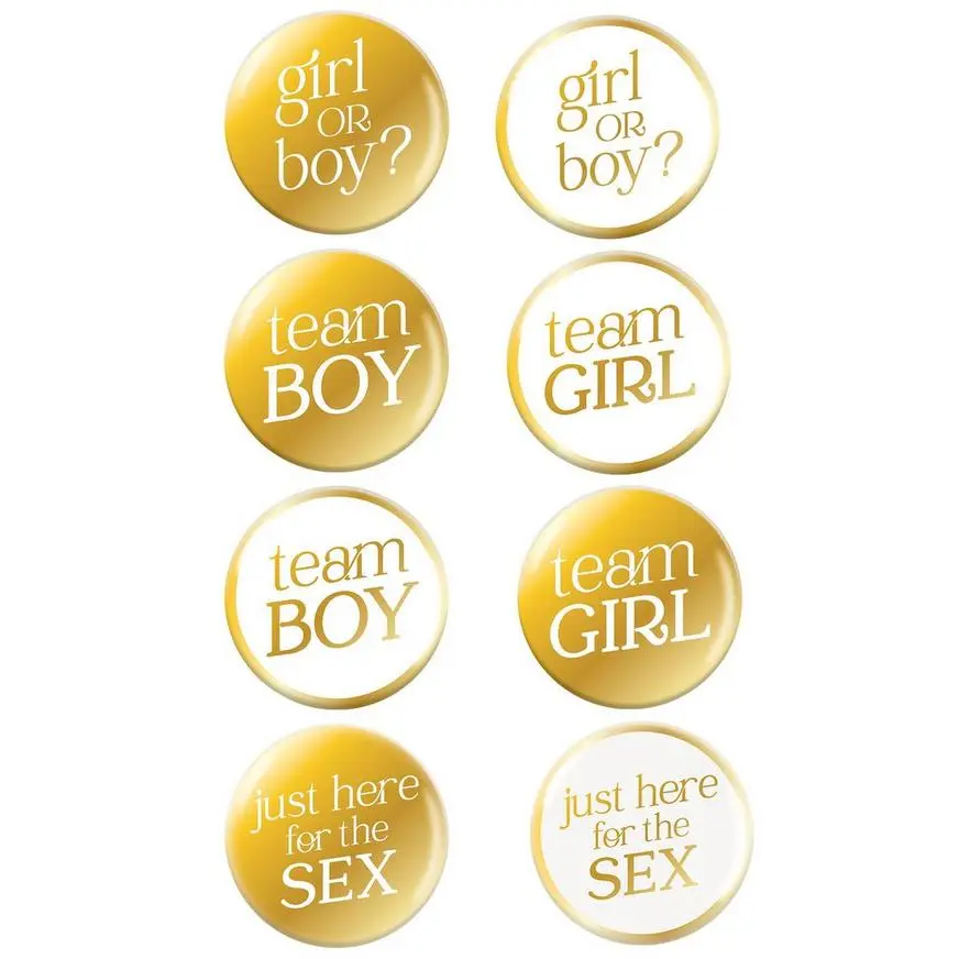 Let guests pick their side with these gender reveal values. They have a simple metallic gold and white design and come in four phrases: “Team Boy,” “Team Girl,” “Girl Or Boy?” and “Just Here For The Sex.”