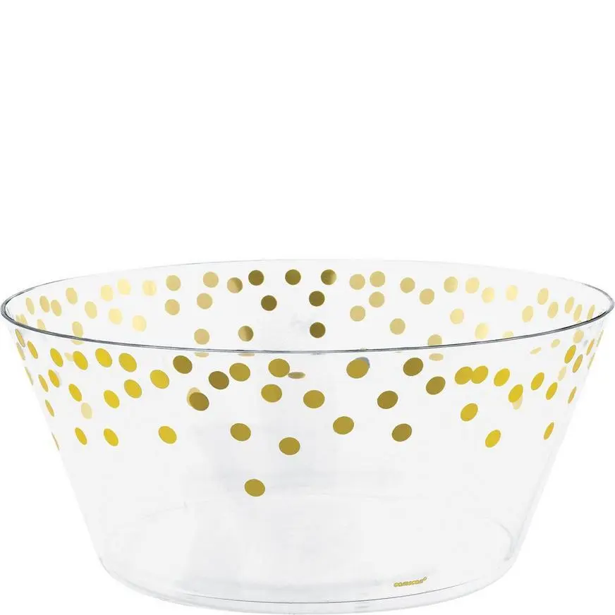 Add a golden touch to the snack table with this Metallic Gold Polka Dots Plastic Serving Bowl! This plastic bowl is clear and has metallic gold dots scattered along the upper lip. Fill this plastic dish up with chips, popcorn, or any of your favorite snacks and set it out for guests at your next celebration!