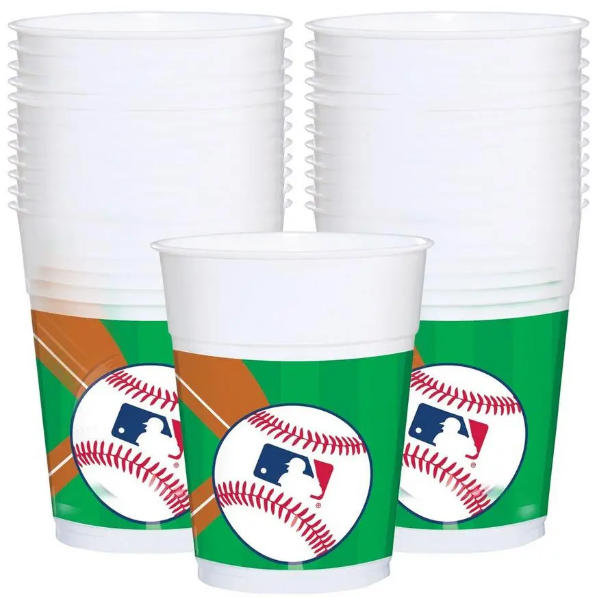 Enjoy majorly delicious beverages from officially licensed MLB Baseball Plastic Cups! These baseball-themed plastic cups are decorated with the official MLB logo on baseball images, printed against a wraparound design of a baseball diamond. Serve delicious drinks in these baseball party cups at your game day party!