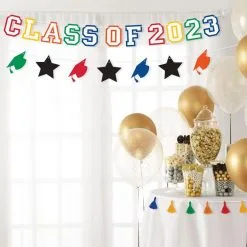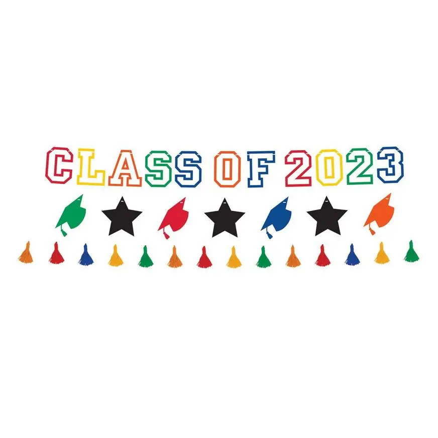 Decorate for your grad’s big celebration with this colorful banner set! The letter banner reads “Class Of 2023” in multicolor cardstock letters. The matching accent banners feature hanging grad caps and stars on the first banner and tassels on the second.