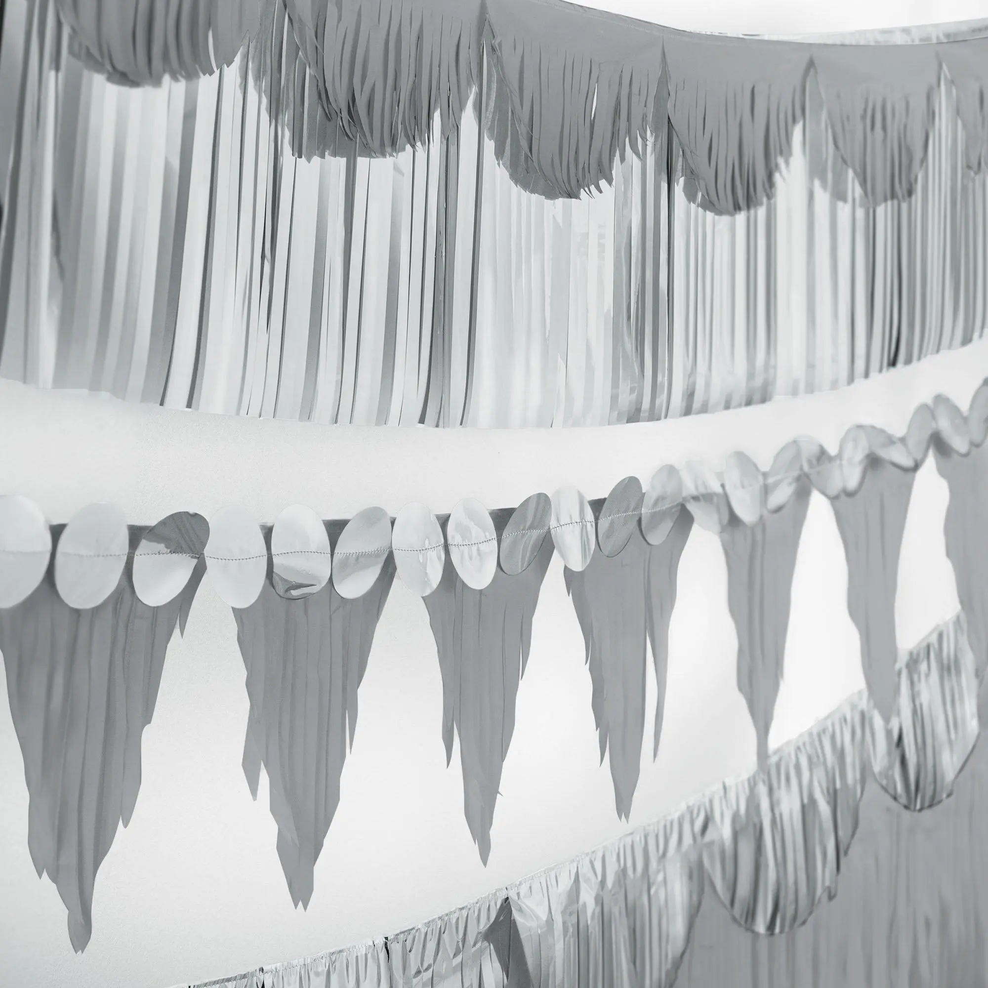 Add a rich layer of color and texture to your party décor with Multishape Silver Fringe Banners! These banners feature bunting, pennants, and circles in silver foil and tissue fringe.