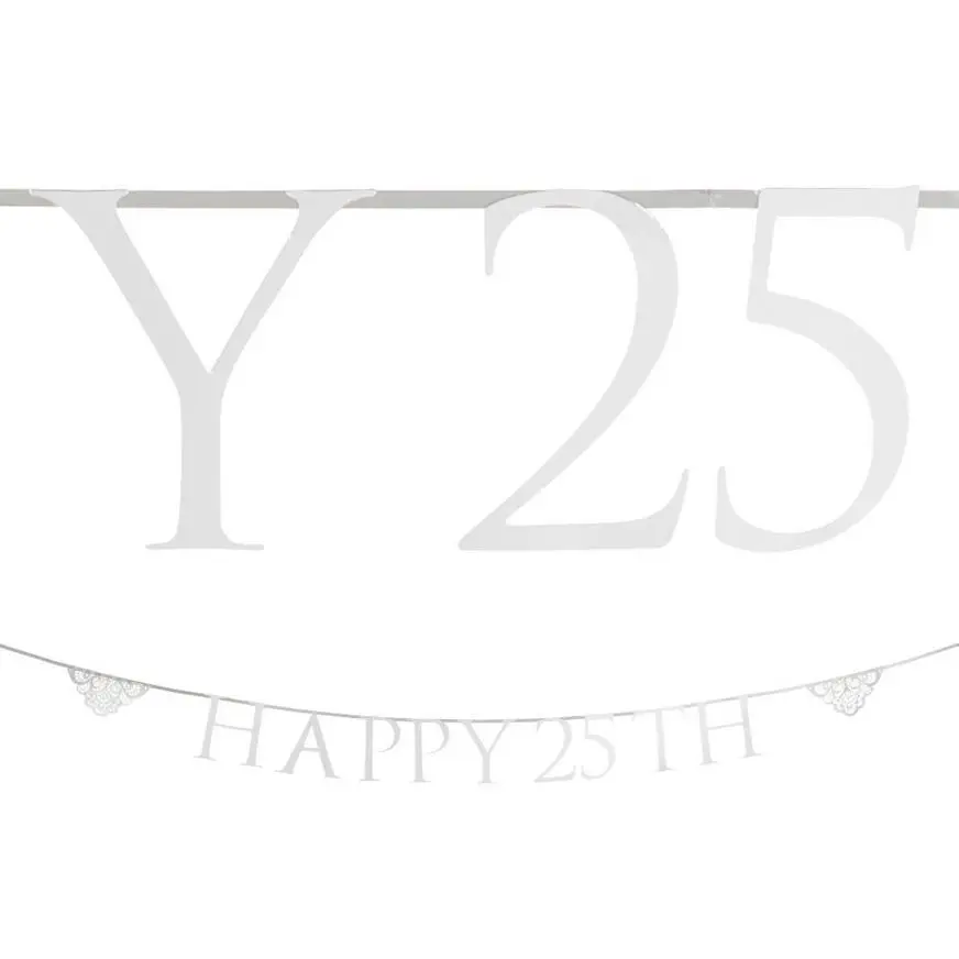 Make your anniversary celebration shine by decorating it with a Metallic Silver 25th Anniversary Letter Banner! This letter banner features metallic silver lace cutouts and metallic silver letter cutouts that spell out “Happy 25th.” Hang this letter banner on the walls, stair railing, or anywhere else in your house to decorate for your anniversary party!